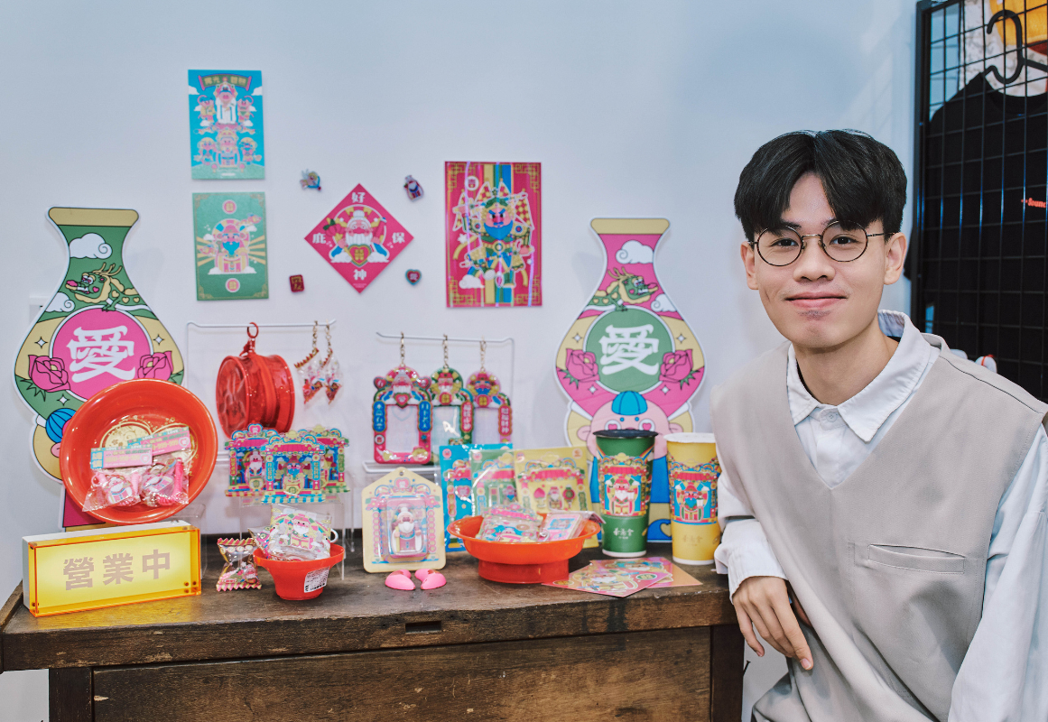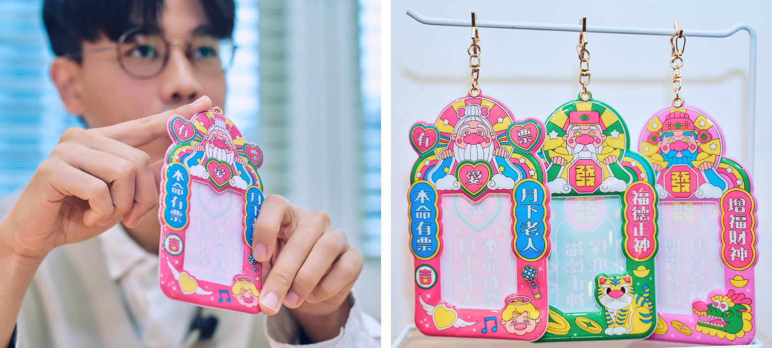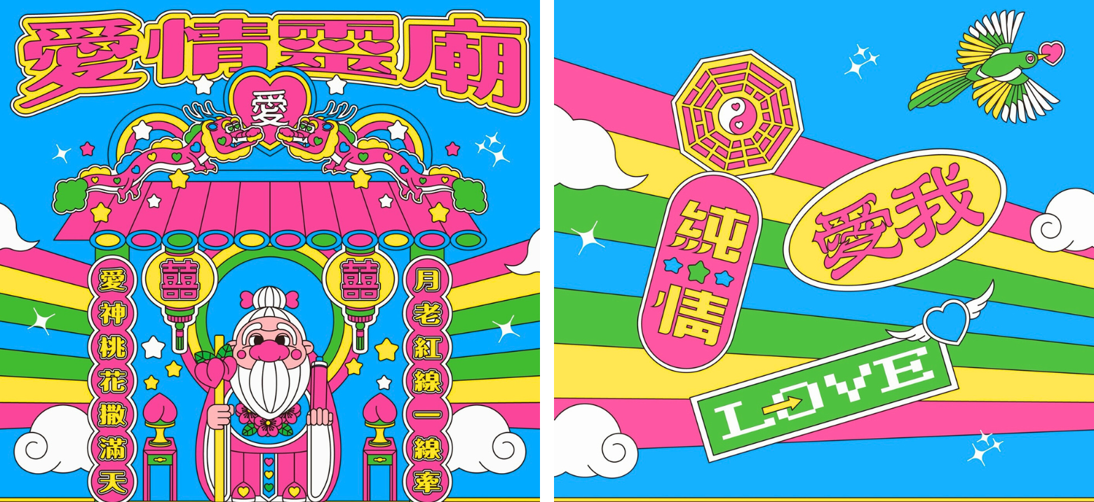 走進插畫品牌「不知道同學」的創作世界裡,繽紛的色彩強烈卻又不衝突,完美襯托出眾神的可愛形象。在他筆下,原本莊嚴的土地公、月老與財神,紛紛化身為童趣療癒的角色,畫面中跳躍著桃紅、亮綠、鵝黃與天空藍,帶有濃厚的Y2K的活潑色彩。以最純真的視角重新詮釋神明,讓復古與現代碰撞出新火花,也翻轉了年輕世代對民俗信仰的既定想像。