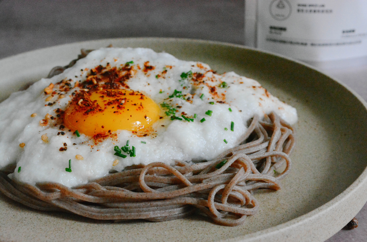 4.磨山藥泥,放在蕎麥麵上,再放上生食蛋黃一顆,撒上喜歡的七味粉,即可沾醬食用!
