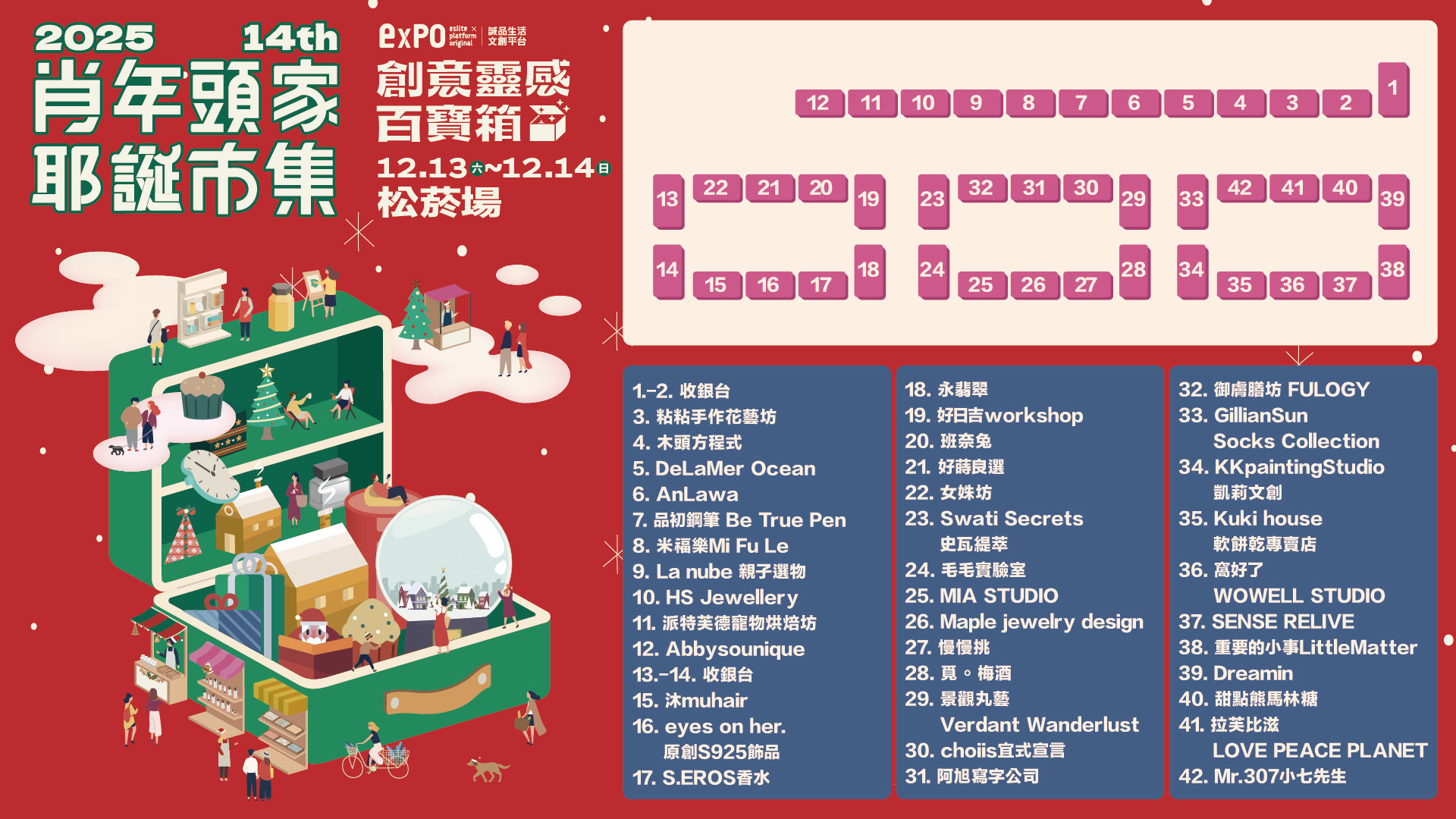 一年中最溫馨又閃亮的時刻來了!致力於培育與推廣新創文化設計品牌及設計師的「誠品生活文創平台expo」,將於2025/12/13~12/14舉辦為期2天的第14屆肖年頭家耶誕市集_松菸場,邀請你走進肖年頭家耶誕市集,感受滿滿節慶氛圍~~