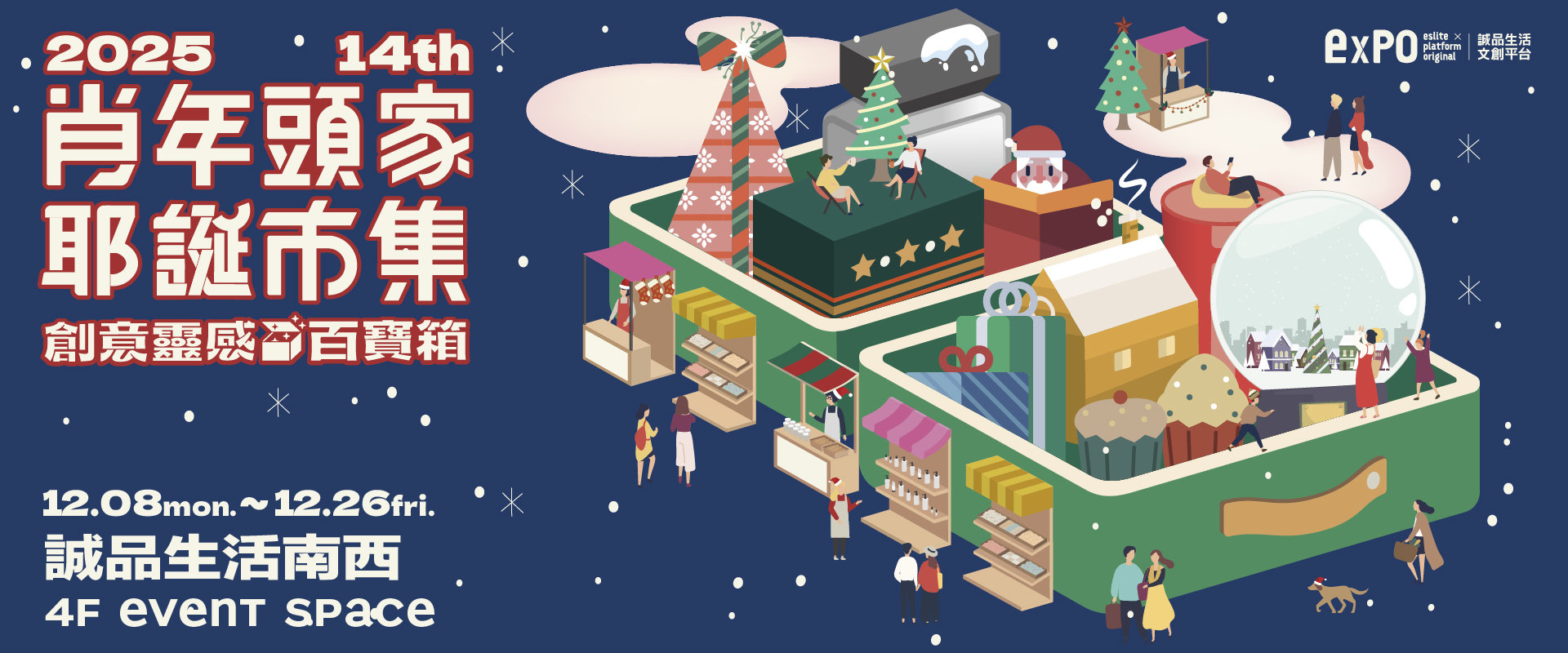 一年中最溫馨又閃亮的時刻來了!致力於培育與推廣新創文化設計品牌及設計師的「誠品生活文創平台expo」,將於2025/12/08~12/26舉辦為期19天的第14屆肖年頭家耶誕市集_南西場,邀請你走進肖年頭家耶誕市集,感受滿滿節慶氛圍~~